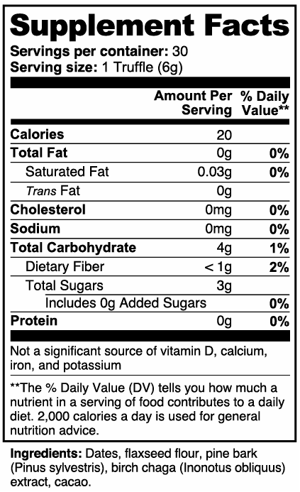 Ingredients: Dates, flaxseed flour, pine bark (Pinus sylvestris), birch chaga (Inonotus obliquus) extract, cacao.