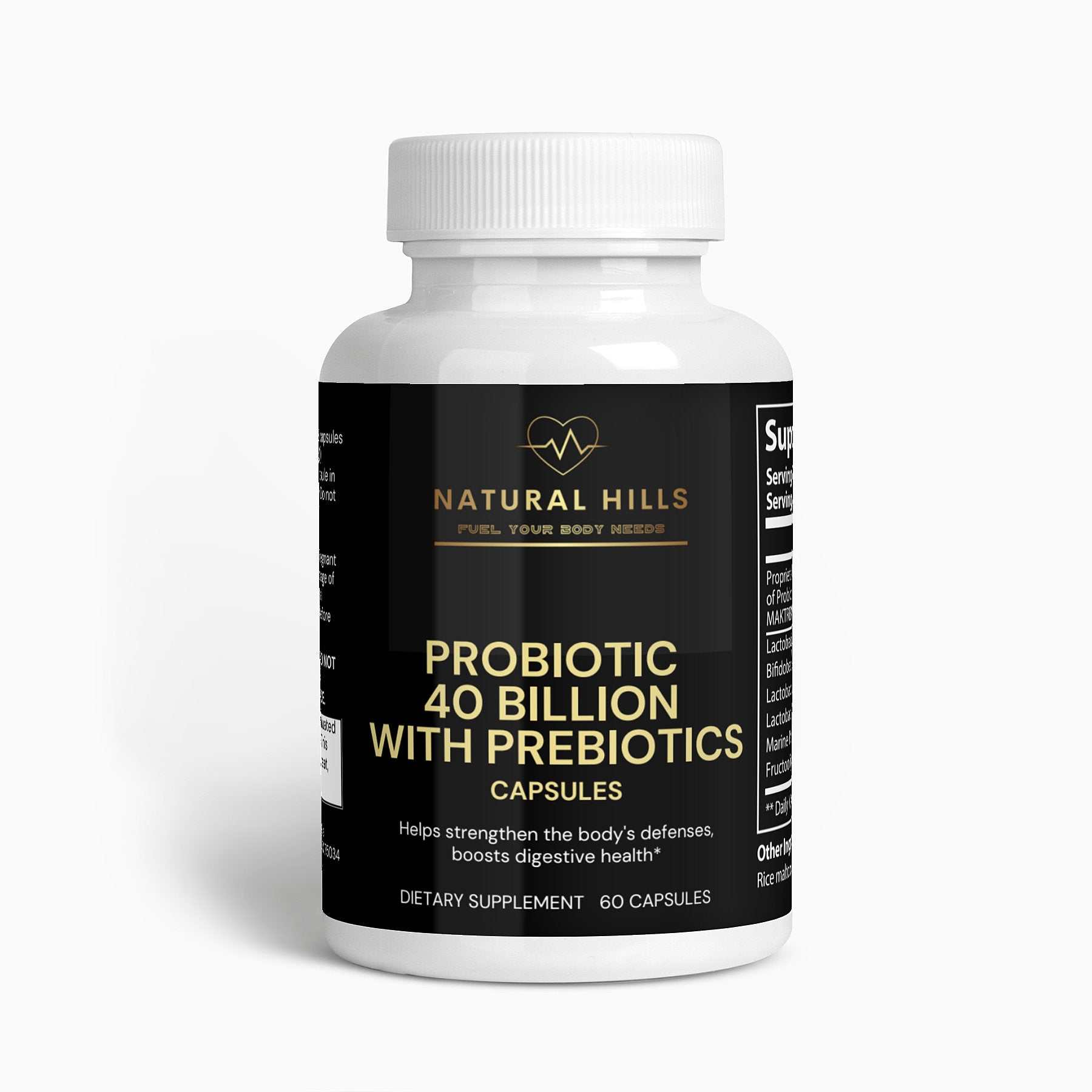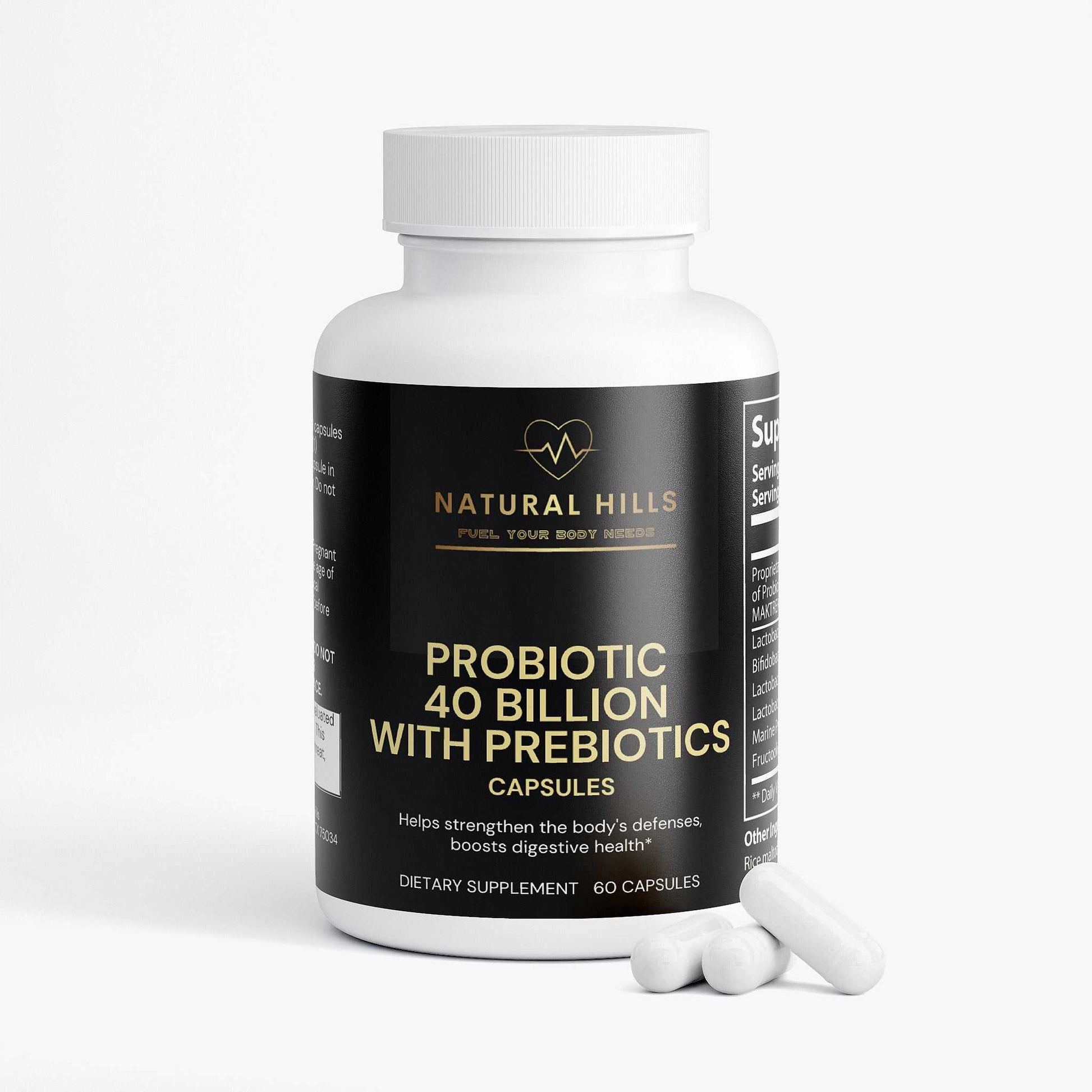 Probiotic 40 Billion with Prebiotics is a blend of four probiotic strains: Lactobacillus Acidophilus, Bifidobacterium Lactis, Lactobacillus Plantarum, and Lactobacillus Paracasei.